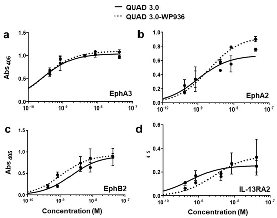 QUAD 3.0-WP936 binding to EphA3, EphA2, EphB2, and IL-13RA2 receptors. ELISA assay showing the binding of unconjugated QUAD 3.0 and QUAD 3.0-WP936 conjugate to (a) EphA3; (b) EphA2; (c) EphB2; and (d) IL-13RA2 receptor proteins.