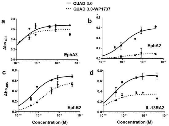 QUAD 3.0-WP1737 binding to EphA3, EphA2, EphB2, and IL-13RA2 receptors. ELISA assay showing the binding of unconjugated QUAD 3.0 and QUAD 3.0-WP1737 conjugate to (a) EphA3; (b) EphA2; (c) EphB2; and (d) IL-13RA2 receptor proteins.