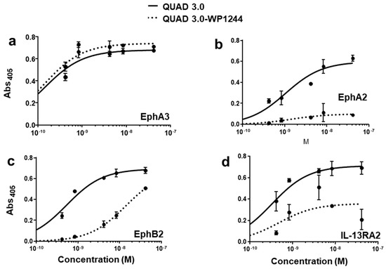 QUAD 3.0 Dox 1244 binding to EphA3, EphA2, EphB2, and IL-13RA2 receptors. ELISA results showing the binding of unconjugated QUAD 3.0 and QUAD 3.0-WP1244 conjugate to (a) EphA3; (b) EphA2; (c) EphB2; and (d) IL-13RA2 receptor proteins.