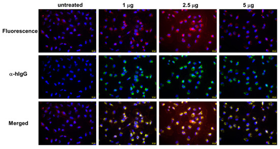 QUAD 3.0-WP936 binding and internalization to U-251 GBM cells. The cells were treated with 1.0–5.0 μg of the conjugate for 4 h. WP936 was detected by red fluorescence in a TRITC channel and QUAD 3.0 by green fluorescence through Alexa-488-conjugated anti-human IgG. Sections were counterstained for DAPI (blue fluorescence) (scale bar: 50 μm).