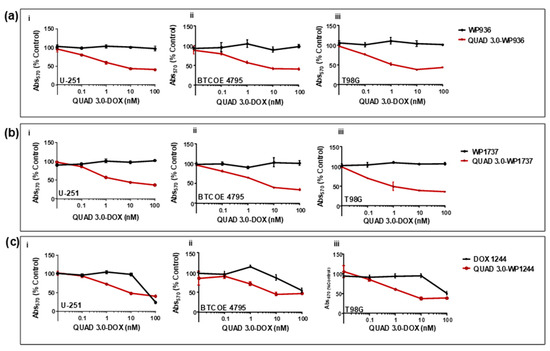 QUAD 3.0-Dox conjugates are cytotoxic to established and patient-derived GBM cell lines. MTT assay of (a) unconjugated WP936 and QUAD 3.0-WP936 conjugates in (i) U-251, (ii) BTCOE 4795, and (iii) T98G cells; (b) unconjugated WP1737 and QUAD 3.0-WP1737 conjugates in (i) U-251, (ii) BTCOE 4795, and (iii) T98G cells; and (c) unconjugated WP1244 and QUAD 3.0-WP1244 conjugates in (i) U-251, (ii) BTCOE 4795, and (iii) T98G cells.