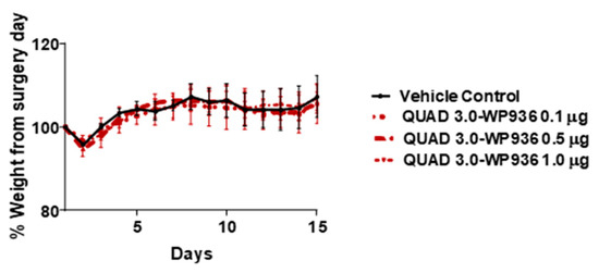 QUAD 3.0-WPD936 is safe in mice. Change in weight (%) of C57BL/6 mice after intracranial injections of QUAD 3.0-WP936.