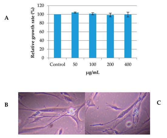 2.5. Evaluation of Cytotoxicity of the O. spinosa Methanolic Extract on Primary Human Gingival Fibroblast Cells