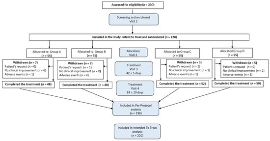 CONSORT flow chart of the disposition of patients in four arms of the study, from Visit 1 to Visit 4, followed by per protocol (PP) and intent-to-treat (ITT) analysis (Figure A1, Figure A2, Figure A3, Figure A4, Figure A5 and Figure A6 and Table A2, Table A3, Table A4, Table A5, Table A6 and Table A7). The figure shows the numbers of patients who were randomized, entered, discontinued, and completed the study as well as the reasons for all post-randomization discontinuations.