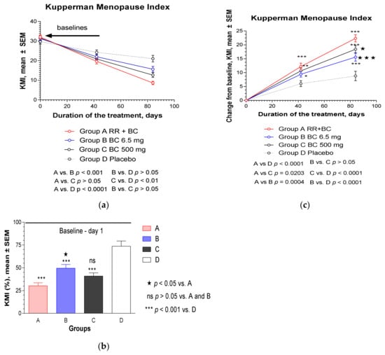 Effects of RR-BC (Group A), BC (Group B), BC500 (Group C), and placebo (Group D) on menopausal symptoms after 12 weeks (84 days) of treatment, as assessed using the KMI: (a) a significant decrease of KMI (mean ± SEM) score compared to baseline values was observed in all groups over time (p < 0.0001); (b) a significant difference in KMI (% to baseline, 100%, mean ± SEM) was observed in groups A, B, and C compared to placebo group at the end of the treatment—day 84, (p < 0.0001), as well as between groups A and B, but not in groups A vs. C and B vs. C; (c) statistically significant interaction effects between treatment groups and response (change from the baseline of KMI, mean ± SEM) over time showed significant difference between group A and groups B, C, and D, as well as groups B vs. C and B vs. D, but not B vs. D (two-way ANOVA). The significance of difference between groups at various time points, calculated by Bonferroni post-test, is expressed by symbols * p < 0.05, ** p < 0.01, *** p < 0.001, ns: not significant (A, B, and C vs. placebo); and * p < 0.05 (B vs. A), *** p < 0.001 (C vs. A).
