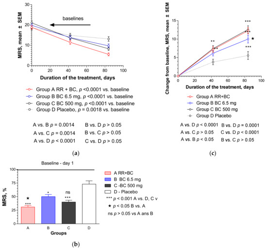 Effects of RR-BC (Group A), BC (Group B), BC500 (Group C), and placebo (Group D) on menopausal symptoms after 12 weeks (84 days) of treatment, as assessed using MRS: (a) significant decrease of MRS (mean ± SEM) score compared to baseline values was observed in all the groups over time (p < 0.0001 in groups A, B, C; p = 0.0018—in placebo group); (b) significant difference in MRS (% to baseline, 100%, mean ± SEM) was observed in A, B, and C groups compared to placebo group at the end of the treatment—day 84, (p < 0.001, A vs. D and B vs. D), as well as between groups A and B, but not groups A vs. C and B vs. C; (c) statistically significant interaction effects between treatment groups and response (change from the baseline of MRS, mean ± SEM) over time showed significant differences between groups A, B, and C vs. placebo, as well as groups B vs. C, but not A vs. B (two-way ANOVA). Significance of difference between groups at various time points, calculated by Bonferroni post-test, is expressed by symbols * p < 0.05, ** p < 0.01, *** p < 0.001; ns: not significant (A, B, and C vs. placebo) and * p < 0.05 (B vs. C).