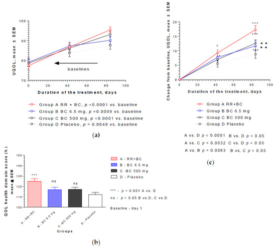 Effects of RR-BC (Group A), BC (Group B), BC500 (Group C), and placebo (Group D) on overall quality of life after 12 weeks (84 days) of treatment, as assessed by the UQOL scale: (a) significant increase of UQOL (mean ± SEM) score compared to baseline values was observed in all groups over time (p < 0.01; p < 0.001); (b) significant difference in UQOL (% to baseline, 100%, mean ± SEM) was observed in group A compared to placebo group at the end of the treatment—Day 84, (p < 0.0001), but not groups B or C vs. placebo; (c) statistically significant interaction effects between treatment groups and response (change from the baseline of UQOL, mean ± SEM) over time showed significant difference between groups A, B, and C vs. placebo, as well as group A vs. groups B and C (p = 0.0083 and p = 0.032) but not between the two BC groups, B and C (two-way ANOVA). Significance of difference between groups at various time points, calculated by Bonferroni post-test, is expressed by symbols * p < 0.05, *** p < 0.001; ns: not significant (A, B, C vs. placebo) and ** p < 0.01 (B and C vs. A).