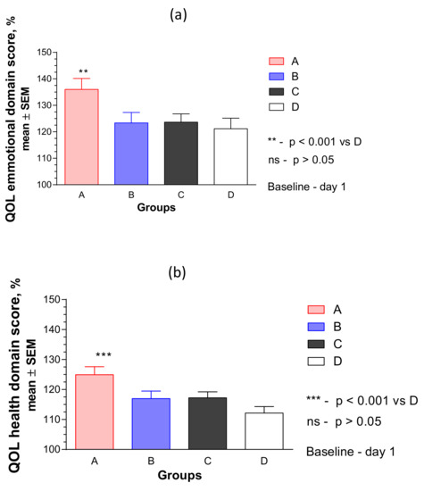 Effects of RR-BC (Group A), BC (Group B), BC500 (Group C), and placebo (Group D) on (a) emotional and (b) physical health domains of quality of life after 12 weeks of treatment, as assessed by the UQOL scale. A significant difference in UQOL (% to baseline, 100%, mean ± SEM) was observed in group A compared to placebo group at the end of the treatment—Day 84, (p < 0.0001), but not between groups B or C vs. placebo; ns: not significant.
