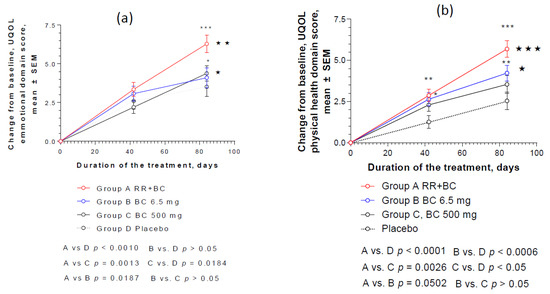 Effects of RR-BC (Group A), BC (Group B), BC500 (Group C), and placebo (Group D) on (a) emotional and (b) physical health domains of quality of life after 12 weeks (84 days) of treatment, as assessed by the UQOL scale: (a) statistically significant interaction effects between treatment groups and response (change from the baseline of physical UQOL, mean ± SEM) over time showed significant difference between groups A, B, and C vs. placebo (respectively p < 0.0001, p = 0006, p < 0.05), as well as group A vs. group C (p < 0.001), but not the two BC groups, B and C (two-way ANOVA); (b) statistically significant interaction effects between treatment groups and response (change from the baseline of emotional UQOL, mean ± SEM) over time showed significant difference between groups A vs. B, C, and placebo groups (respectively, p = 0.0187; p = 0.0013; p < 0.001). Significance of difference between groups at various time points, calculated by Bonferroni post-test, is expressed by symbols * p < 0.05, ** p < 0.01, *** p < 0.001, ns: not significant (A, B, C vs. placebo); and * p < 0.05, ** p < 0.01 *** p < 0.001 (A vs. B and C).