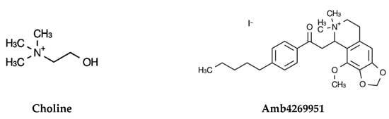 Chemical structure of choline (2-hydroxyethyl(trimethyl)ammonium) and Amb4269951 (4-methoxy-6,6-dimethyl-5-(2-oxo-2-(4-pentylphenyl)ethyl)-5,6,7,8-tetrahydro-[1,3]dioxolo [4,5-g]isoquinolin-6-ium iodide).