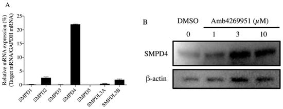 Effect of Amb4269951 on the expression of sphingomyelinases in U251MG cells. (A) Real-time PCR analysis of the mRNA expression of SMPD1-5, SMPDL3A, and SMPDL3B in U251MG cells. The percentage of relative mRNA expression is expressed as the ratio of the target mRNA to the glyceraldehyde-3-phosphate dehydrogenase (GAPDH) mRNA. Each column represents the mean ± SD (n = 3). (B) Effect of Amb4269951 on the expression of SMPD4 protein in U251MG cells. Cells were incubated with various concentrations of Amb4269951 for 4 h. Western blot analysis shows the SMPD4 and ß-actin levels in whole cell lysates of drug-treated U251MG cells.