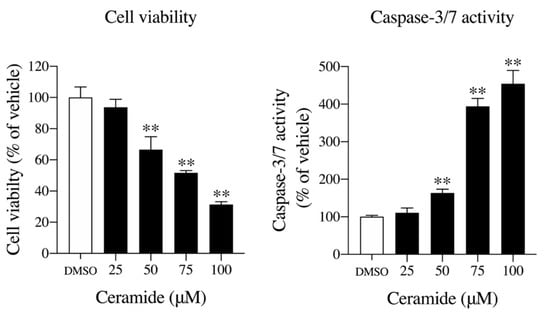 The effects of ceramide on cell viability and caspase-3/7 activity in U251MG cells. Cells were pre-incubated with various concentrations of ceramide for 12 h, and then the cell number and caspase-3/7 activity were measured. The results are given as a percentage of the findings in the vehicle control (DMSO). Each column represents the mean ± SD (n = 4). ** p < 0.01 compared to the vehicle control (DMSO).