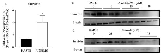 Therefore, we examined the effect of Amb4269951 and ceramide on the expression of survivin, which is known to be highly expressed in tumor cells. The qPCR results revealed a significant increase in the expression of survivin in U251MG cells, compared to HASTR/ci35 cells (Figure 6A). Western blot analysis showed that 24 h treatment with Amb4269951 reduced the expression of survivin in a concentration-dependent manner (Figure 6B). The increase in SMPD4 expression due to Amb4269951 may induce apoptosis by degrading sphingomyelin and increasing ceramide production. Therefore, using ceramide, we also investigated whether survivin was involved in the induction of apoptosis. Treatment with ceramide for 24 h decreased the expression of survivin in a concentration-dependent manner (Figure 6B).