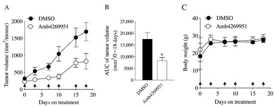 Effect of Amb4269951 on U251MG xenograft tumor progression and body weight. (A) The tumor volume was measured after intraperitoneal administration of 10 mg/kg Amb4269951 (n = 5) and the vehicle control with DMSO (n = 5). The date of administration is indicated by an arrow. (B) The Amb4269951 group significantly reduced xenograft tumor growth compared to the DMSO group (* p < 0.05). (C) The body weight of mice was measured at the time of drug administration. Data are represented as the mean ± SD (n = 5).