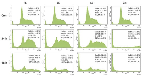 Figure 1. Cell cycle distribution at different phases (SubG1, G0/G1, S, and G2/M) of Caco-2 cells treated with extracts (0.20 mg/mL) and cisplatin (0.02 mg/mL) for 24 and 48 h and analyzed using flow cytometry after staining with PI (propidium iodide). Cis, cisplatin; Con, control (untreated cells). FE, floret extract; LE, leaf extract; SE, seed extract.