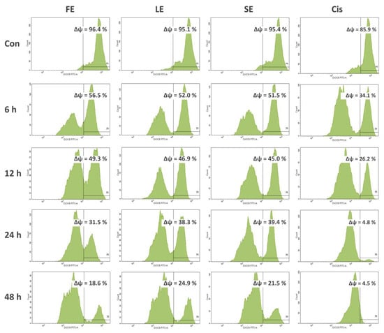 Figure 2. The changes of the mitochondrial membrane potential (ΔΨ) level in Caco-2 cells treated with broccoli extracts (0.20 mg/mL) and cisplatin (0.02 mg/mL) for various time points and analyzed using flow cytometry after staining with DiOC6 (3,3′-dihexyloxacarbocyanine iodide).