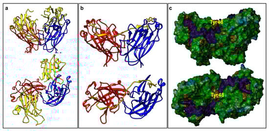 Molecular models of EphA2-LBD in complex with its agonistic agents. (a) Front view and top view of the molecular models representing the biological dimeric unit of EphA2-LBD (red and blue), in complex with ephrinA5 (yellow) (PDB ID 3MX0). (b) Front view and top view of the molecular model of 135H12 (yellow; Table 1) in complex with EphA2-LBD (red and blue). The model was build based on the dimeric biological unit of EphA2-LBD in complex with 135E2 (Table 1; PDB ID 6B9L). (c) Molecular surface representation of the models shown in (b) generated with MOLCAD (Sybyl-X 1.2). 135H12 surface is in magenta, while the surface for EphA2-LBD dimer is color coded according to hydrophobicity (MOLCAD). The position of residue Tyr48, at the bridge between the two monomer, is highlighted.
