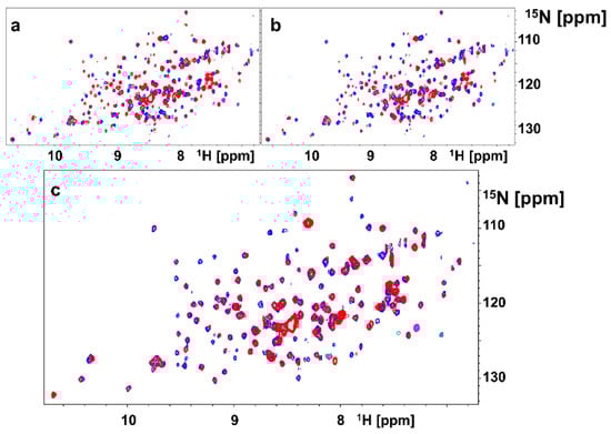 2D NMR [15N,1H] spectra with 15N-labeled EphA2-LBD. (a) Superposition of 2D NMR spectra of EphA2-LBD (20 μM), recorded in absence (blue) and presence (red) of 135G3 (20 μM). (b) Superposition of 2D NMR spectra of EphA2-LBD (20 μM), recorded in absence (blue) and presence (red) of 135G4. (c) Superposition of 2D NMR spectra of EphA2-LBD (20 μM), recorded in presence of 135G3 (blue) or in presence of 135G4 (red).