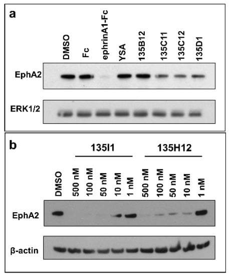 Dimeric and tetrameric EphA2 agonistic ligands degrade EphA2 receptor. (a) Western blot study of HCT116 cells treated with ephrinA1-Fc, EphA2 agonistic monomers (YSA, 135B12), and EphA2 agonistic dimers (135C11, 135C12, and 135D1) for 2.5 h (10 μM each). Total anti-EphA2 blot indicates that ephrinA1-Fc treatment led to complete degradation of the receptor, while EphA2 dimeric ligands treatments showed partial decrease of the receptor. Total ERK1/2 blot was used as a loading control. (b) Pancreatic cancer BxPC3 cells were treated with tetrameric (135I1) and dimeric (135H12) compounds for 1 h. These compounds successfully degraded EphA2 receptor at nanomolar concentrations.