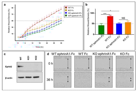 The monomeric, unbound EphA2 receptor is known to be pro-oncogenic, inducing cell migration of cancer cells, while ephrinA1-Fc, inducing EphA2 dimer formation can suppressed this activity [35]. To more directly examine the effect EphA2 on pancreatic cancer cell migration we first prepared a stable BxPC3 EphA2 knockout (KO) cell line and monitored its migratory properties using the scratch wound method and live-cell analysis (IncuCyte S3, Sartorius) (Figure 4). Briefly, homogeneous scratch wounds on plated cells were created by a 96-pin mechanical device (WoundMaker, Sartorius, Göttingen, Germany). Subsequently, live-cell imaging was performed to monitor the rate of wound closure. As controls, we also tested wild-type (WT) BxPC3 cells, and each cell type was treated with ephrinA1-Fc, or Fc as control (Figure 4). Cell migration was significantly attenuated in the EphA2-KO cells compared to WT-BxPC3 cells. In addition, the migratory properties of EphA2-KO cells was similar (not significantly different) to that of wild-type cells treated with ephrinA1-Fc (Figure 4a,b). Furthermore, treatment of EphA2-KO cells with ephrinA1-Fc did not significantly decrease the rate of migration (Figure 4). EphrinA1-Fc is a promiscuous ligand and could in principle activate several EphA or EphB receptor subtypes [36], hence any inhibitory effects observed when treating cells with ephrinA1-Fc may be due to a variety of Eph subtypes. However, the data reported in Figure 4 suggests that in BxPC3 the A2 subtype alone contributes to the pro-migratory properties of the cell line.