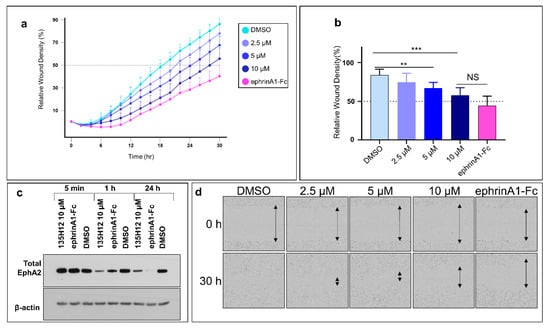 Cells were plated at 50 × 103 cells/well density in 96-well ImageLock plates (Sartorius). The following day, cells were scratched using the WoundMaker (Sartorius) and washed three times with PBS. Subsequently, cells were treated with the indicated compounds in RPMI-1640 complete media. Treatments included ephrinA1-Fc (1 μg/mL) and test agents 135H12 (2.5 μM, 5 μM, and 10 μM). Plates were imaged every two hours using IncuCyte S3 (Sartorius), and relative wound areas were analyzed using the algorithm of the imager cell migration software module.