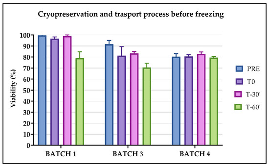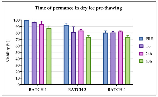 Apart from Batch 4, where viability largely remained unchanged, the viability remained stable for Batches 1, 2 and 3 only within 30 min from the addition of the freezing solution before the start of the cryopreservation process, while after 60 min this decreased and caused two cases of out-of-specification (OOS) with a Δ% of viability of >15% (see Figure 2). The values of viability were, however, greater than 70% in both cases. There were no statistically significant differences in the observed parameters.