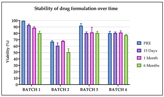 Viability of Batches 1, 2, 3 and 4 evaluated to validate the stability of the cellular product over time. The percentage of viable cells was calculated on fresh product at the time of pre-freezing (PRE) and at different time periods: 15 days, 1 month and 6 months.