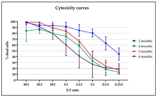 To evaluate if the thawed cells preserved their cytotoxic activity, CIK cells, at different months post freezing, were co-cultured with sarcoma tumor cells (target cells) in different ratios. To ensure the same tumor target, it was decided to carry out the cytotoxicity test simultaneously on the cryopreserved CIK cells of all the batches available on the test date, corresponding to 6 months from the freezing of the first batch, as showed in Figure 6. In a second subsequent test, cytotoxicity was also assessed at 9 (n = 2) and 12 months (n = 1).