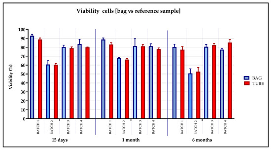 Viability evaluated on Batches 1, 2, 3 and 4 to validate the stability of the cellular product in bags and tubes. The percentage of viable cells was calculated concurrently on the bags (red histograms) and tubes (blue histograms) at the different cryopreservation time periods: 15 days, 1 month and 6 months.