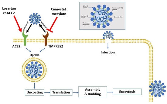 Virus entry into the host cell. The attachment protein “-spike glycoprotein” of the severe acute respiratory syndrome-2 (SARS-CoV-2) uses a cellular attachment factor (angiotensin-converting enzyme 2 (ACE2)) and uses the cellular protease TMPRSS2 (transmembrane protease serine 2) for its activation. ACE2 can be activated via either losartan or recombinant human ACE 2 (rhACE2). Potential pharmacotherapeutic approaches include the use of camostat mesylate (which is a TMPRSS2 inhibitor) to block the priming of the spike protein, increasing the number of ACE2 receptors via losartan, and the use of soluble recombinant human ACE2 (which should slow viral entry into cells via competitive binding with SARS-CoV-2). The structure of SARS-CoV-2 is shown in the upper right.