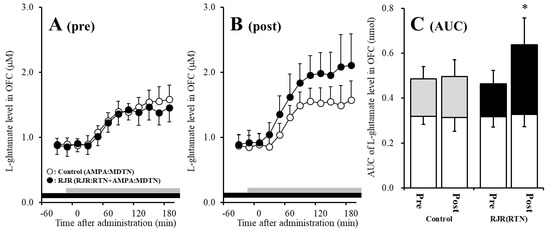 Effects of local administration of 100 μM (E)-N-Methyl-4-(3-pyridinyl)-3-buten-1-amine oxalate (RJR2403) (RJR: selective α4β2-nAChR agonist: closed circles) into the RTN on pre-AMPA-evoked (panel A) and post-AMPA-evoked (panel B) l-glutamate release (before and after hemichannel activation induced by perfusion with FCHK-MRS into the MDTN for 20 min) in the OFC of wild-type. Ordinates indicate mean extracellular l-glutamate level (μM) (n = 6), and abscissas indicate time after AMPA-evoked stimulations (min). Closed bars indicate the perfusion with RJR2403 into the RTN. Gray bars indicate the perfusion with 100 μM AMPA into the MDTN. (Panel C) indicates the AUC value of the extracellular l-glutamate level (nmol) before (basal extracellular l-glutamate level) and after AMPA-evoked stimulation (from 20 to 180 min) of panels (A,B). Opened columns indicate the AUC values of basal extracellular levels of l-glutamate in panel (A,B). * p < 0.05; relative to control by MANOVA with Tukey’s post hoc test. The control data were the same data in study 1 (Figure 2).