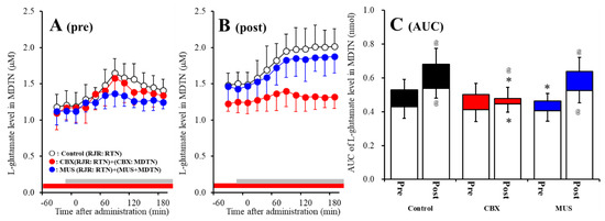 Effects of local administration of 100 μM CBX (non-selective hemichannel inhibitor) and 1 μM MUS (GABAA receptor agonist) into the MDTN on pre-RJR- (panel A) and post-RJR-evoked (panel B) l-glutamate release (before and after hemichannel activation induced by perfusion with FCHK-MRS into the MDTN for 20 min) in the MDTN of S286L-TG. Ordinates indicate mean the extracellular l-glutamate level (μM) (N = 6), and abscissas indicate time after RJR-evoked stimulations (min). Gray bars indicate the perfusion with 100 μM RJR2403 into the RTN. Red bars indicate the perfusion with 100 μM CBX or 1 μM MUS into the MDTN. (Panel C) indicates the AUC value of the extracellular l-glutamate level (nmol) before (basal extracellular l-glutamate level) and after RJR-evoked stimulation (from 20 to 180 min) of panels (A,B). Opened columns indicate the AUC values of basal extracellular levels of l-glutamate in panel A and B. * p < 0.05 relative to control, @ p < 0.05 relative to before hemichannel activation (pre) by MANOVA with Tukey’s post hoc test.