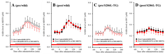 Effects of local administration of 100 μM CBX (non-selective hemichannel inhibitor) into the MDTN on pre-RJR- (panels A,C) and post-RJR-evoked (panels B,D) GABA release (before and after hemichannel activation induced by perfusion with FCHK-MRS into the MDTN for 20 min) in the MDTN of wild-type (panels A,B) and S286L-TG (panels C,D). Ordinates indicate mean extracellular GABA level (μM) (N = 6), and abscissas indicate time after RJR-evoked stimulations (min). Gray bars indicate the perfusion with 100 μM RJR2403 into the RTN. Red bars indicate the perfusion with 100 μM CBX into the MDTN.