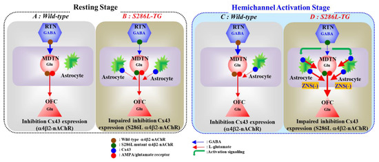 Our previous studies demonstrated that impairment of the excitatory effects of S286L-mutant α4β2-nAChR on GABAergic neurons in RTN played important roles in the hyperactivation of thalamocortical and thalamic hyperdirect glutamatergic transmissions [21,22]. Exactly, the inhibitory effect of application of α4β2-nAChR agonist (RJR2403) into the RTN on glutamatergic transmission in the thalamocortical cognitive pathway was abolished in S286L-TG (Figure 5 and Figure 9). The abolishment of GABAergic inhibition on thalamocortical cognitive pathway can be pharmacologically explained by the loss-of-function of S286L-mutant α4β2-nAChR function; however, the detailed mechanisms of relative GABAergic disinhibition induced hyperactivation of thalamocortical motor pathway [21] remain to be clarified. In the present study, the hypothesis the complex between loss-of-function α4β2-nAChR and upregulated Cx43 can successfully clarify the mechanism of enhancement of the thalamocortical motor pathway induced by relative GABAergic disinhibition of S286L-TG.