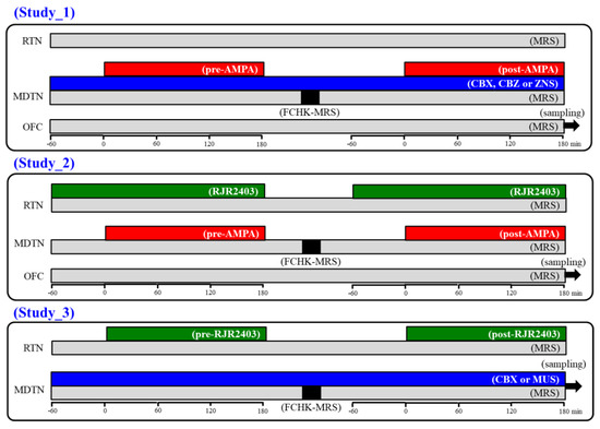 Schematic experimental designs of microdialysis. MRS: modified Ringer’s solution (gray columns), FCHK-MRS: Ca2+-free with 100 mM K+ containing MRS (closed columns), RJR2403 (100 μM: selective α4β2-nAChR agonist): (E)-N-Methyl-4-(3-pyridinyl)-3-buten-1-amine oxalate, AMPA (100 μM: AMPA/glutamate receptor agonist): amino-3-(3-hydroxy-5-methyl-isoxazol-4-yl) propanoic acid, CBX (100 μM: non-selective hemichannel inhibitor): carbenoxolone, CBZ (100 μM): carbamazepine, MDTN: mediodorsal thalamic nuclei, RTN: reticular thalamic nucleus, OFC: orbitofrontal cortex, and ZNS (500 μM): zonisamide.