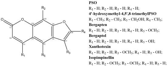 Linear furanocoumarins and their structures, namely: psoralen (PSO); 4’-hydroxymethyl-4,5’,8-trimethylpsoralen; bergapten; bergaptol; xanthotoxin; and isopimpinellin.