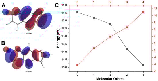 The rendered model evidenced that PSO’s first HOMO state showcased higher charge density around the furan ring (Figure 2A), thus suggesting that this moiety may exhibit higher thermodynamic proneness to undergoing oxidation []. Moreover, the LUMO surfaces concentrated around the pyrone moiety (Figure 2B), and the plot of molecular orbital versus their respective energies in eV showcased that for both compounds, LUMO charge shifted towards positive values, while HOMO shifted towards negative values (Figure 2C). This is an expected trend, given that higher states involve higher shifts in energy when redox processes are concerned, as showcased in a previous report [].