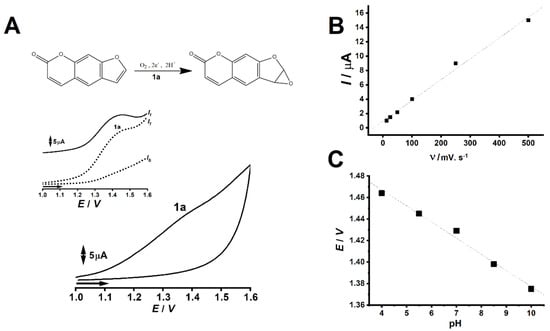 (A) Cyclic and Square Wave voltammograms showcasing the anodic peak (1a), which is associated to psoralen oxidation. The depicted CV was performed at 500 mV s−1. (B) Plot of anodic peak 1a faradaic current (I) vs. scan rate (ν) (r2 = 0.9932). (C) Plot of pH vs. electric potential associated to peak 1a (E) (r2 = 0.9874). All assays were performed in 0.1 mol L−1 PBS solution, pH 7.0, and Ag/AgCl/KClsat as reference electrode.