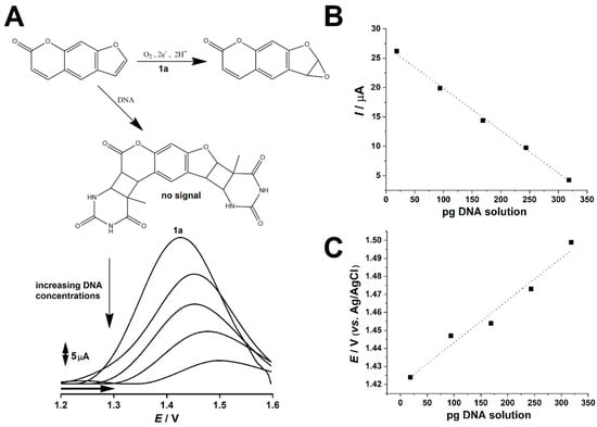 (A) Differential pulse voltammogram showcasing the effect of DNA addition on the anodic peak (1a) which is associated to psoralen oxidation. DNA-bound psoralen is non-electroactive, thence showcasing no anodic peak. (B) Plot of anodic peak 1a faradaic current (I) vs. the amount of added DNA (r2 = 0.9973). (C) Plot of electric potential associated to peak 1a (E) vs. the amount of added DNA (r2 = 0.9712). All assays were performed in 0.1 mol L−1 PBS solution, pH 7.0, and Ag/AgCl/KClsat as reference electrode.