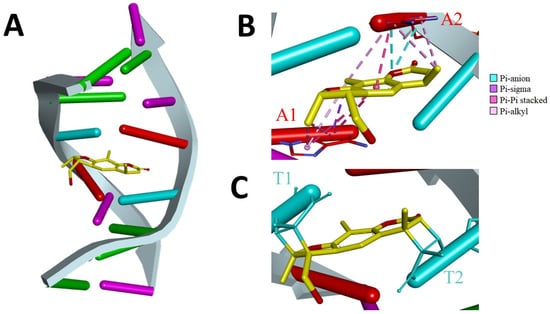 The model for the cross-linkage between PSO and dsDNA showed that the twofold symmetry of the DNA duplex was broken by PSO adduct formation (Figure 5A). PSO initially intercalates noncovalently between base-pairs of the DNA duplex which may stabilize its structure due to charge delocalization, as well as lead to steric hindrance [,,], thus hindering electro-oxidation and increasing the electric potential associated with peak 1a, as seen in Figure 3. The adenine bases are stacked coplanar with PSO, and this arrangement allows electrostatic (Pi-anion) and hydrophobic (Pi-sigma, Pi-Pi-stacked, and Pi-alkyl) interactions (Figure 5B) []. On the other hand, thymine is the primary nucleoside in dsDNA at which reaction occurs []. The thymine bases were in cis-syn geometry relative to PSO, and the reaction takes place between the carbon atoms C5 and C6 of the thymines bonded to carbon atoms C4 and C3 of the pyrone ring, and to carbons C4′ and C5′ of the furan ring of PSO, thus leading to the formation of the cyclobutanyl adduct [,,]. The covalent structure of the cross-link fixes the orientation and position of thymines and bridges the helix (Figure 5C), moreover this bonding is non-reversible without photolyase enzymes, which therefore explains the linear dependence of the faradaic current generated by PSO oxidation and the concentration of DNA in the test solution.