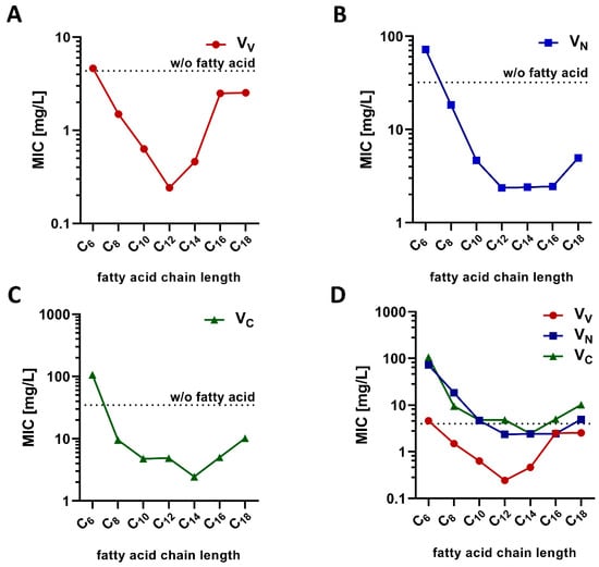 Figure 2) demonstrated a high variability in the antimicrobial potential (as shown by the varying MIC values), depending on the fatty acid chain length. Interestingly, the MIC values decreased upon shortening the fatty acid chain length till C