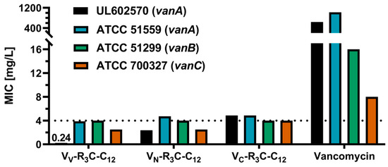 Figure 3). Nevertheless, all modifications showed an increased antimicrobial potential when compared to unmodified vancomycin, as demonstrated by the highly decreased MIC values.