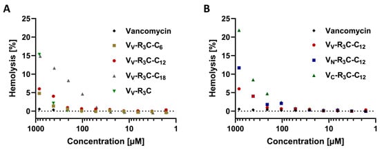 Based on these promising results and to enable subsequent in vivo experiments, the most active conjugates were further characterized with respect to potential cytotoxic effects. In order to investigate the hemolytic behavior, human blood from healthy volunteers was taken and exposed to different concentrations of selected conjugates. As a control, unmodified vancomycin, known to have non-hemolytic properties up to 12 mM [