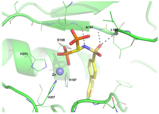ML 115 binds the catalytic zinc ion of MMP-8 in a monodentate fashion with one phosphonate moiety (Figure 2, Figure S1). Meanwhile, the second phosphonate group is oriented towards the solvent. One oxygen of the first phosphonate moiety is also hydrogen-bonded with the catalytic Glu198 side chain. The sulfonamide moiety is hydrogen-bonded with the backbone NH of Leu160 and the backbone NH and CO of Ala161 belonging to the antiparallel β-strand of MMP–8. As expected, the biphenyl group is inserted into the S1’ site. Extended hydrophobic interactions with the S1’ loop account for high MMPI activity.