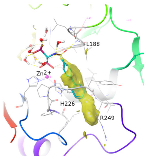 The analysis of obtained docked poses shows that all ligands bind in the expected way, with the bisphosphonic function and the sulfonamide maintaining the crystallographic geometry of ML 115. Enzyme inhibition assays confirm the validity of the suggestion derived from the SiteMap analysis (Figure 3) to elongate the P1’ portion of new inhibitors in order to improve MMP-9 inhibition, since, indeed, newly synthesized compounds better occupy the hydrophobic S1’pocket. Compound 9, in particular, almost perfectly fits in the hydrophobic field calculated by SiteMap for MMP-9, with the bromine substituent interacting with the Arg249 (Figure 5 and Figure S4). These positive interactions and the high complementarity with the hydrophobic field of the S1’ site can contribute to explaining the improved activity of this ligand with respect to ML 115 [36]. Therefore, we moved from an inactive hit (ML 115) to a nanomolar ligand (9) towards the target isoform MMP-9 by a more effective adaptation of the ligand to the large hydrophobic field in the enzyme S1’ site.