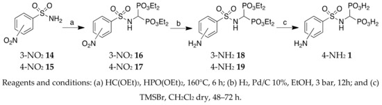 Bisphosphonic acids 1–13 were prepared by treating the appropriate commercially available sulfonyl chloride with 30% NH4OH to obtain the corresponding sulfonamides 14–15 (Scheme 1) and 23–24 (Scheme 2). Resulting compounds were treated with triethylorthoformate and diethyl phosphite to give the tetraethyl-1,1-bisphosphonates 16–17 and 25–26. Reduction of the nitro group of tetraethyl (4-nitro-phenylsulfonylamino)methyl-1,1-bisphosphonate (17) and dealkylation of bisphosphonate esters 19, 25, and 26 under acidic conditions or with TMSBr afforded the desired bisphosphonic acids 1–3.