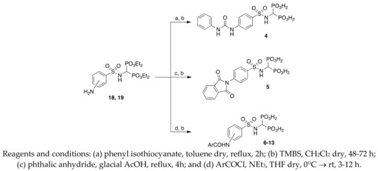 The synthesis of bisphosphonic acids 4–13 (Scheme 3) involves the acylation of the anilino derivatives 18 and 19 with phenyl isothiocyanate, phthalic anhydride, or the appropriate acyl chloride. Dealkylation of bisphosphonate esters with TMSBr afforded bisphosphonic acids 4–13.