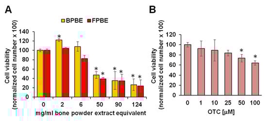 Effect of bone powder extracts on K562 cell viability. Cells were incubated for 24 h with the indicated concentrations of either biologically raised poultry bone extract (BPBE) and intensive-farming raised poultry bone extract (FPBE) (A) or oxytetracycline (OTC) (B) and directly counted by the Trypan Blue exclusion test. Bars are means ± SEM of four independent biological replicates for each condition and are percentages of vehicle-treated cells; * p < 0.05 vs. 0 g/mL of bone extracts or 0 mM OTC.