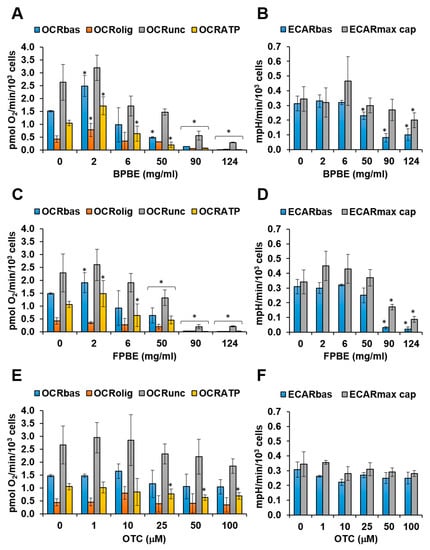 Effect of chicken bone powder treatment on the metabolic fluxes in K562 cells. Cells were incubated for 48 h with the indicated concentrations of either BPBE (A,B) and FPBE (C,D), or OTC (E,F) and then subjected to metabolic flux analysis as detailed under Materials and Methods. The different OCRs and ECARs parameters are detailed in Figure 2. Bars are means ± SEM of 3–4 independent experiments with three technical replicates each; * p < 0.05 with respect to the same parameter in untreated cells (“0” concentration of the compound).