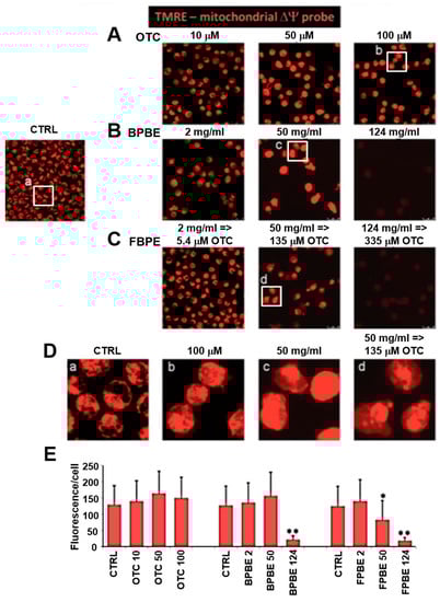 To provide independent evidences of the effect of the compound treatments on the mitochondrial activity, we utilized laser scanning confocal microscopy to image the respiration-driven mitochondrial membrane potential (ΔΨm) in live cells using the mitotropic fluorescent probe tetramethylrhodamine, ethyl ester (TMRE) [27]. For this analysis, we selected only three conditions corresponding to low, intermediate, and high concentrations of the compound’s treatment. The results illustrated in Figure 4B,C show that at the lowest dilution tested, both BPBE and FPBE treatment caused an increasing reduction in ΔΨm consistent with the inhibition of the mitochondrial respiratory activity. No significant changes in the intensity of the ΔΨm-related fluorescent signal was detectable at low and intermediate concentrations. On the contrary, pure OTC treatment of K562 cells did not result in appreciable changes of the TMRE fluorescence at all the concentrations tested, Figure 4A. Enlargements of the images allow the appreciation of the intracellular distribution of the fluorescent signal (Figure 4D); in the untreated control cells, the signal was localized in an interconnected extranuclear compartment clearly resembling the mitochondrial network and a comparable distribution was observed in cells treated with 100 μM OTC.